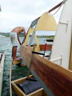 And four hundred miles to the West of us in CURACAO, our dear friend TIMO is hard at work building his new yacht, after losing his previous one to the rocks in Los Aves, VENEZUELA (refer: Older Postings) ...... Now his construction method is radical, although he says it is 'rational' ........... Each cedar piece is glued and screwed to the previous one, and eventually the hull is covered in cloth and epoxy resin before being turned over and having the keel added .......
